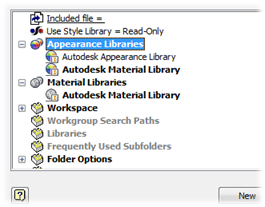 - In the Project File Editor, Appearance Libraries , right-click the Inventor Material Library node and select Remove Library. Repeat this step in Material Libraries. Save the changes.