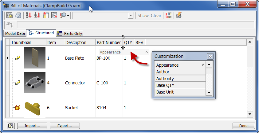 The model Appearance value is added as a selectable property. You can add the Appearance property to a bill of materials or a parts list.