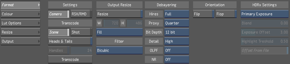 - Sets the high-level options for the media decoding (e.g., debayering, resizing, filter, etc.). This submenu is exclusive to RED and ARRIRAW media. See Transcode Format Settings.