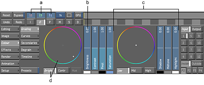 (a) Printer light settings (b) Brightness slider (c) Brightness controls for shadows, midtones, and highlights (d) Brightness Balance wheel and button