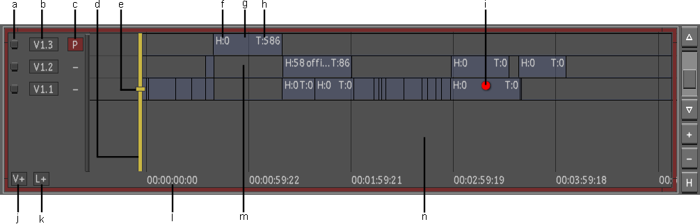 (a) Layer selector (b) Track/Layer name (c) Primary Track/Layer indicator (d) Positioner(e) Track/Layer selector(f) Element Head (g) Element (h) Element Tail(i) Shot Priority indicator (j) Add Video Track button (k) Add Video Layer button