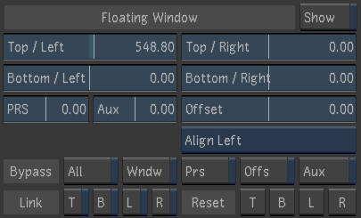 - Lastly the Bypass buttons enable you to bypass specific parameters. The Link buttons allow you to link corners together, making it possible to modify more than a single Floating Window corner with a single slider. And the Reset buttons enable you to reset the values of the top (T), bottom (B), left (L) and right (R) parameters, respectively.