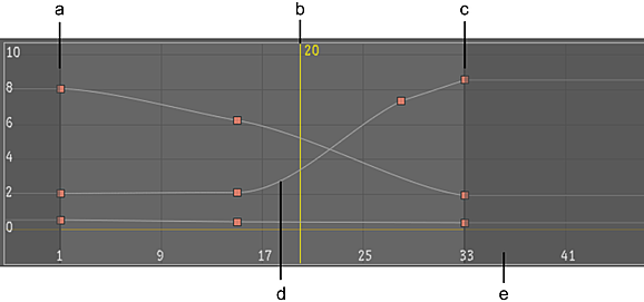 (a) Start of current shot (b) Positioner (c) End of current shot (d) Animation curve (e) Trimmed frames