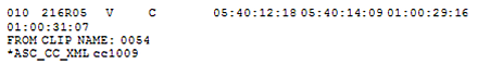 The ASC_CC _XML note begins with the '*ASC_CC_XML' note ID string and is followed by the file name that associates that shot with a unique XML file. This XML file follows the XML implementation of the ASC CDL. An example of the reference line added to the EDL file is as follows.
