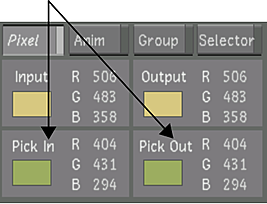 Both the original (Pick In) and modified (Pick Out) colours are displayed simultaneously in the lower section of the Pixel Analyser. The RGB values for the selected pixel are also displayed.