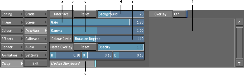 (a) Gain slider (b) Matte Overlay (c) Gamma slider (d) Background slider (e) Colour Circle slider (f) Overlays field (g) Update Storyboard button