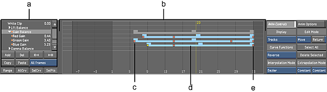 (a) Channel hierarchy (b) Track Editor (c) First keyframe in channel (d) A selected channel (e) Last keyframe in channel