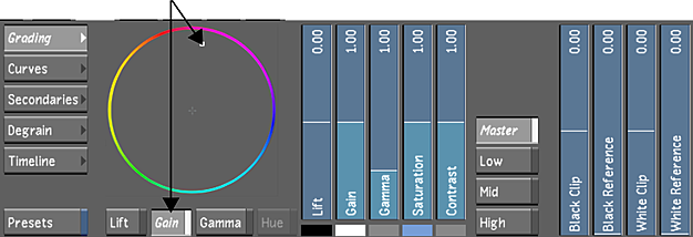 - To offset the colours while maintaining the overall gain, enable Gain and then drag the Gain Balance wheel towards a colour you want to boost.
