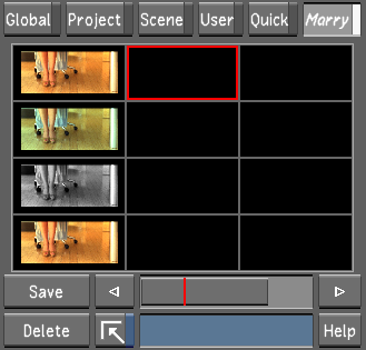 When you save a grade using the Marry controls, the colour grading metadata is saved separately from the regular grade file. Marry grade files are saved in the same location as the original shots (except for shots imported from Wiretap or the Wiretap Gateway). Marry grade files can also be saved and loaded with the Marry Grade bin thumbnails and Grade view. See Using the Marry Grade Bin.