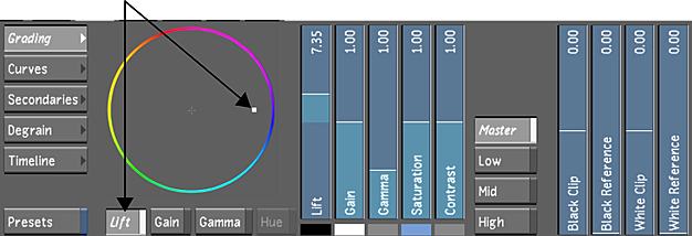 You can lift colour values in a selected range or in the entire image, and then offset ranges of colour. Changes in lift mostly affect black level. Although lift affects the entire image or image level, visually, it mostly affects the shadows.