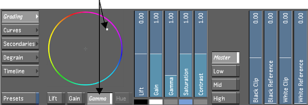 Note: When you use a slider or colour balance wheel to colour grade a shot, the colour range is limited by the control (the edge of the colour wheel, for example). Use the Autodesk control surface or the Tangent CP100 control surface to reach the full spectrum of colour.