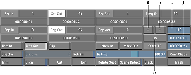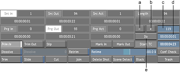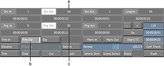 (a) Src Out field (b) Trim Out button (c) Prg Out field