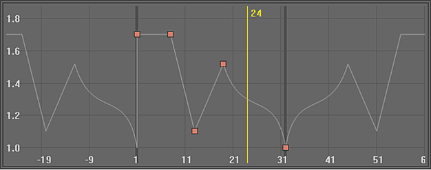 Extrapolation defines the shape of the animation curve outside the keyframes. You can set up a cycle in which channel values change repeatedly in the same manner over time. You can set the extrapolation before the first keyframe separately from the extrapolation after the last keyframe.
