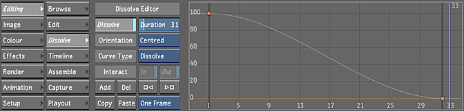 The Dissolve menu allows you to animate your dissolve. Use the controls located in the lower left side of the Dissolve editor to add, delete, copy, paste and navigate between keyframes. Navigate the timeline to edit any transition using the Dissolve menu's editor and curve window. Use the navigation buttons, the hotkeys or the Autodesk Control Surface to navigate the timeline.