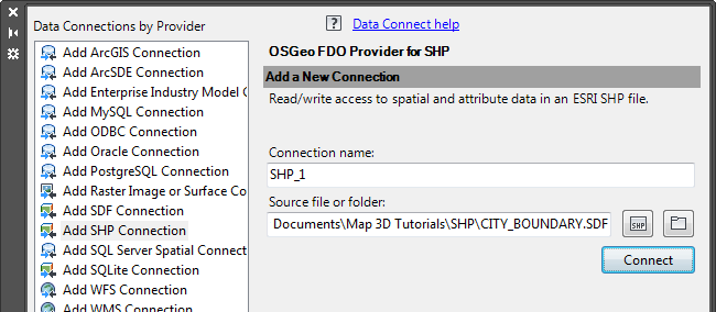 - In the Data Connect window, under Data Connections By Provider (on the left), select Add SHP Connection.