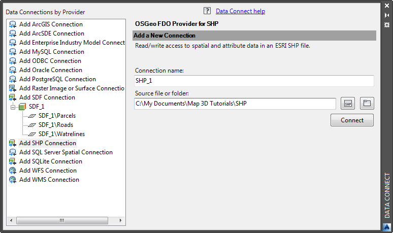 Create a new, empty folder to contain the SHP files. To convert and copy data to the SHP format, you must be connected to this folder. You use Data Connect to establish connections to data stores, even when you do not add anything to the map from the data store.