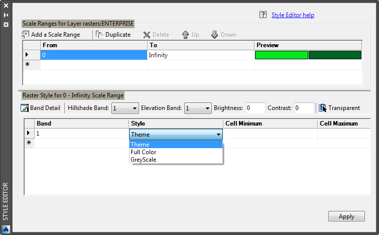 - In the Style Editor, under Raster Style For 0 - Infinity Scale Range, click the down arrow in the Style entry. Select Theme (even if it is already selected).