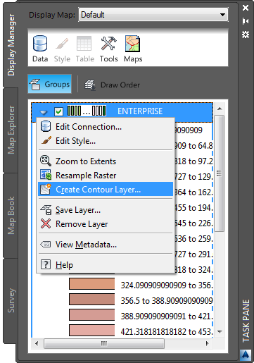 In Display Manager, right-click the surface layer to create contours.