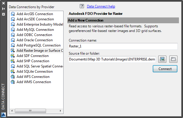 - In the Data Connect window, under Data Connections By Provider, click Add Raster Image Or Surface Connection and click