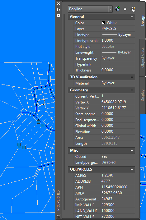The drawing layers in your DWG file become the feature classes in the new schema. The object data properties in the drawing determine the properties for each feature class. Use the Properties palette to see the object data.
