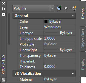 The roads are objects in an AutoCAD drawing. Notice that the current selection is defined as a Polyline. For drawing objects, you can format some properties with the Properties palette.