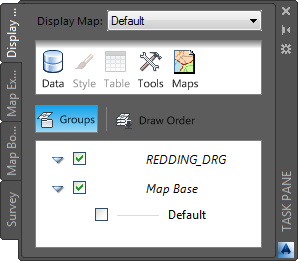 The Display Manager tab of the Task pane controls the styling and display of items in your map. The layers in the Display Manager are different from AutoCAD layers, but they allow you to do similar things. For example, you can hide and show Display Manager layers, even if those layers contain raster images rather than drawing objects.
