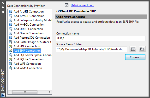 - Under Data Connections By Provider (on the left side), click Add SHP Connection.
