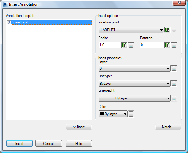 Use the annotation template you defined in the previous exercise to insert instances of the annotation into the drawing. Every drawing object that contains data for speed limit in the object data table will display its own speed limit value.