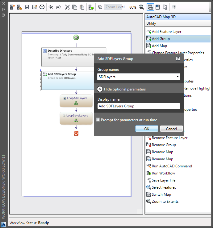 Expand the Show Optional Parameters section. Click the down arrow next to the Group field and, under Results Of Previous Actions, expand the Add SDFLayers Group activity and select Group.