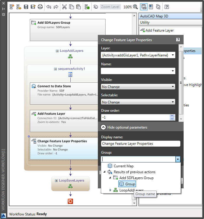 Drag the Change Feature Layer Properties activity inside the LoopAddLayers activity and place it just after Create Layer. Change its parameters to specify the layers to change and the group for the layers.