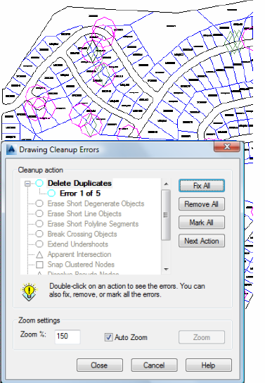 Using Drawing Cleanup tools, you can automate the correction of common drafting and digitizing errors. Delete duplicates, correct undershoots and dangling objects, and more.