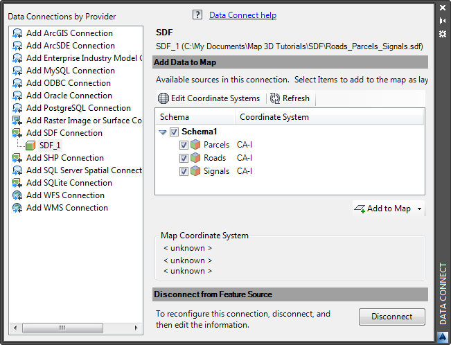 In this exercise, you connect to the new SDF file you created and see the feature classes that were created from the three object classes.