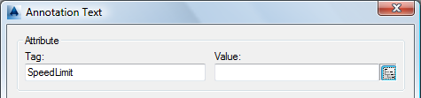To attach text labels to drawing objects, create an annotation template first. An annotation template is a type of AutoCAD block. You define the template by defining the block in the Block Editor. The Block Editor is the canvas on which you lay out the components of the annotation. The relationship between each component determines how the annotation appears on each object when you attach the annotation later. For example, if you place a static label above a dynamic value, the final annotation has two lines (one above the other), like this example: