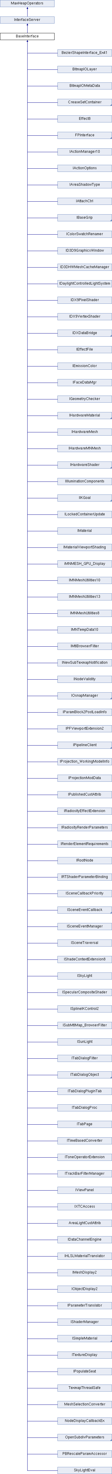 This class represents the base class for interfaces in 3ds Max. The BaseInterface class should be used as the base class for any new interface class in 3ds Max and provides basic identity, memory management, and cloning methods. Class FPInterface, which is part of the Function Publishing system, has the BaseInterface class as its base class.