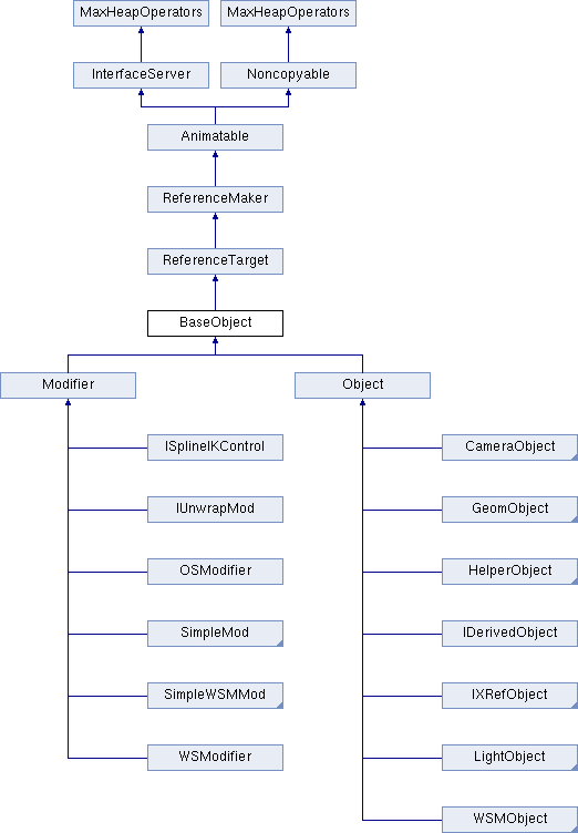 Anything with a representation in the 3D viewports is derived from BaseObject (including modifiers and controllers whose gizmos appear in the viewports). The methods here are things such as displaying the object in the viewports, checking for intersection of the object and points the user clicks with the mouse, snapping to the object, and computing various bounding boxes for the object. Also there are methods for returning the name of the object to appear in the modifier stack, a method to deal with creating the object in the viewports (if appropriate), and named selection set related methods. There are also methods that allow other plug-ins to access the changeable parameters of the object. Finally there are several method that deal with sub-object selection, sub-object display, sub-object hit testing, and moving/rotating/scaling sub-object components of the object.