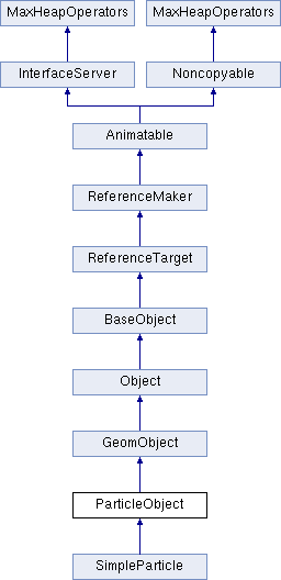 Many particle systems may be derived from class SimpleParticle instead of this class. See Class SimpleParticle for more details. Note: This class is derived from GeomObject and still has GEOMOBJECT_CLASS_ID as its super class. To determine if an object is a ParticleObject, call: Animatable::GetInterface() with the ID I_PARTICLEOBJ or use the macro: GetParticleInterface(anim) where anim is the object in question. This will return a ParticleObject* or NULL. See Class Animatable . Note: See the method Animatable::GetProperty() for details on choosing the method used to evaluate the particle system during motion blur rendering.