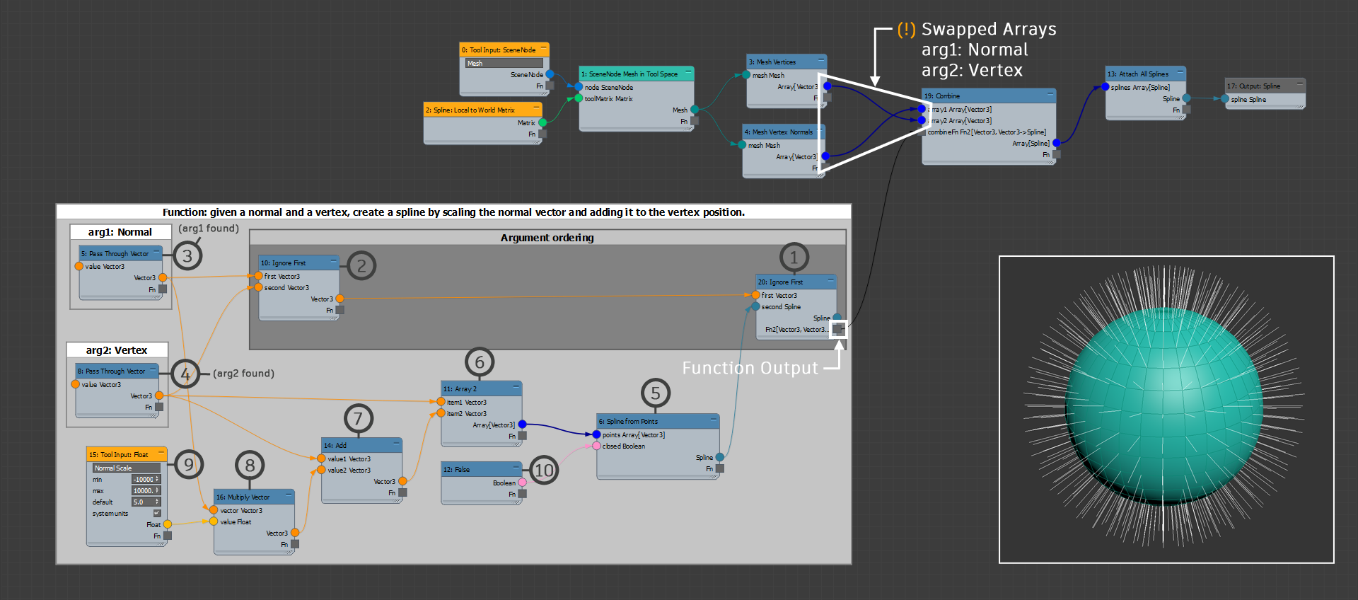 As a (convoluted) exercise, the graph below illustrates how Ignore First can be used to control the node traversal (and therefore the argument ordering) explicitly. Note that Ignore First evaluates its first branch but discards the result, then returns the result of its second branch. Ignore First and Ignore Second can be used to control function argument ordering, or to control the order of execution of operators which have side-effects in 3ds Max (ex: Clone as Instance, Create Editable Mesh, Create Editable Spline, Evaluate MAXScript).