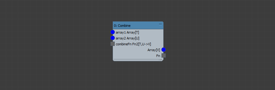 Operators like Combine require functions with more than one input. Multi-input functions are expressed with the shorthand prefix (Fn2, Fn3, Fn4, etc) along with comma-separated types to the left of the arrow symbol (->). In the case of Combine, the function Fn2[T,U->V] requires two generic inputs T, U, and outputs a generic type V.