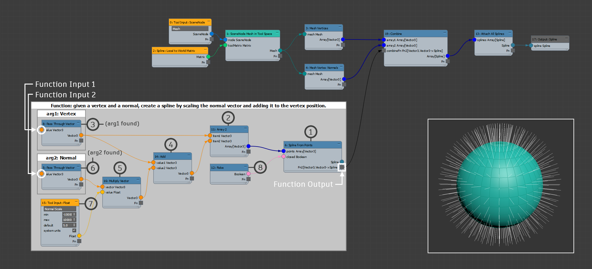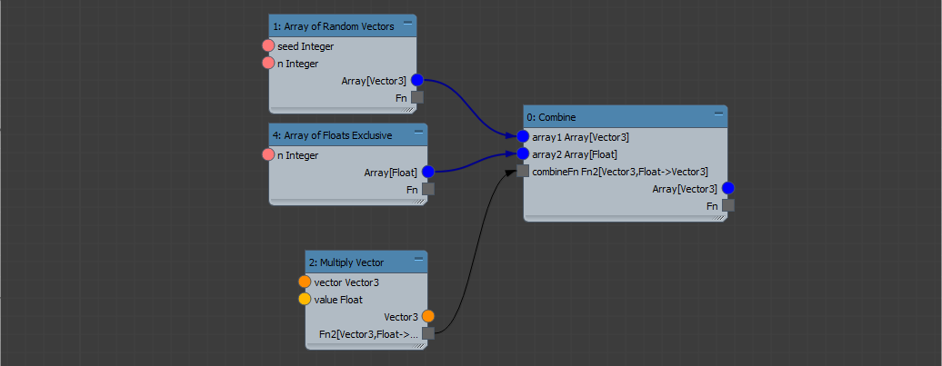 Functions in MCG are represented as sub-graphs connected by a square function connector. Functions have inputs, an output, and are primarily used to transform arrays.