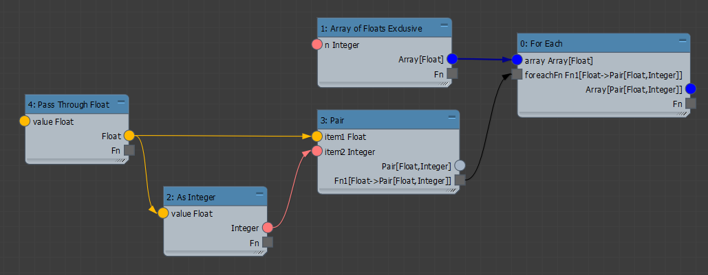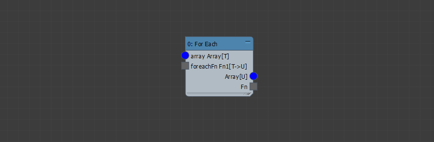 On the For Each node, the generic type T is shared with the input array type Array[T], meaning that the type T of the function's argument must match the type T contained in the array. To see this in action, connect an Array[Float] into the array slot. The type T is now inferred as a Float in the function's type.