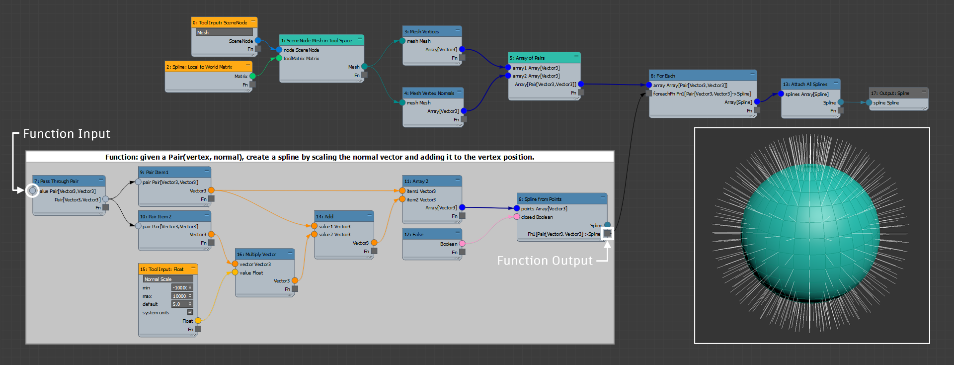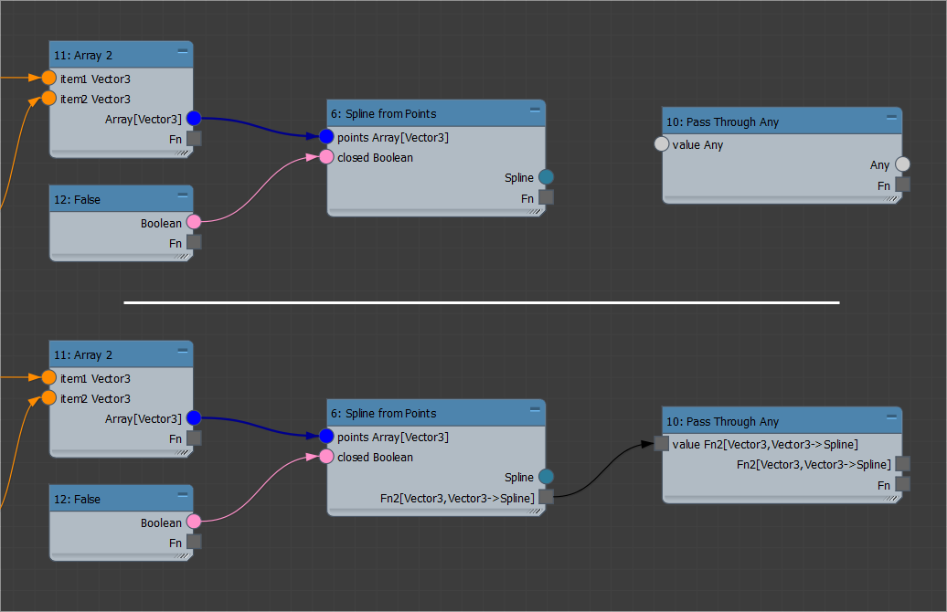 In the example above, the function's input is the unconnected input of Pass Through Pair. The function's output is the result of Spline from Points. In this graph, a new spline is created for each input, and the resulting array of splines is returned in the For Each node's output.
