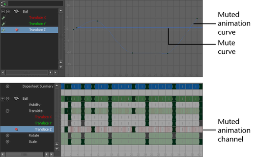 You can view, manipulate, and add keys to this mute channel or curve in the Dope Sheet or Graph Editor. This is useful when you want to isolate and review specific parts of your animation. When you edit a mute channel or curve, its corresponding animation curve automatically updates in the Dope Sheet and Graph Editor view areas.
