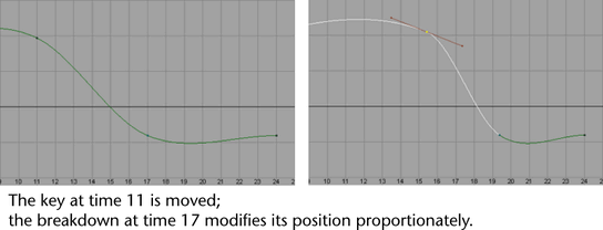 Breakdowns are special keys that maintain proportional time relationships with adjacent keys. For example, as shown in the figure below, if you move the key at time 11 forward along the timeline to speed up an action, the breakdown at time 17 also moves forward to maintain a smooth transition to the key at 24, which is not moving.