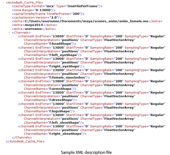 When you create a geometry cache, your cache is saved to disk as a .mcx or .mcc (Maya cache) file. A .xml description file is also generated for your cache. The XML (eXtensible Markup Language) description file contains a list of important cache attributes that Maya uses to locate the data files for your geometry cached objects and other useful information like its cache’s time range. You can use the XML description file to keep track of your geometry cache files and their associated objects and scenes.