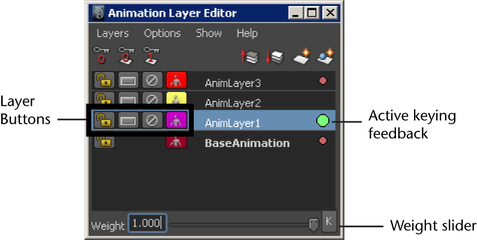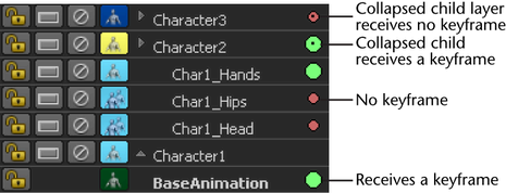 Visual feedback on each layer in the Animation Layer pane shows you which layer will be keyed if you set a keyframe at the current time. The state of each animation layer depends on the keying mode you have selected in the Options menu. (See also Animation layer states and Keyframe objects on animation layers.)