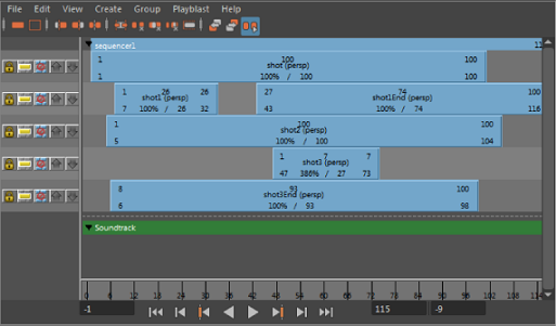 You can also use the Camera Sequencer, which lets you lay out and manage camera shots, then produce rendered movie footage of the animation in your scene. In the Camera Sequencer, shots are represented as a set of rectangles arranged on tracks, and you define and manipulate which camera is active at any point in time by manipulating the camera shots. When you’re satisfied with the layout and timing of camera shots, you can playblast movie clips of the animation.