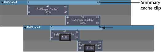 Trax Editor, drag the left or right sides of the summary cache clip to scale all the selected object’s geometry cache clips.