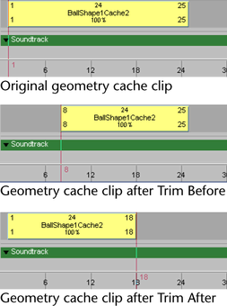 You can trim geometry cache clips to omit segments of deformation from the beginnings or ends of your cache clips. This changes a cache clip’s Source In and Source Out times. Trimming your cache clips does not affect their associated cache files on disk. The segments that you omit from a cache clip using Trim are not deleted, and can be reinstated if the cache clip’s original length is restored.