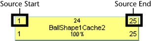 If you change your cache clip’s Source Start value, then you are trimming frames from the beginning of your cache clip. If you change your cache clip’s Source End value, then you are trimming frames from the end of your cache clip. See Source Start/Source End. The trimmed frames are not deleted from the clip or its associated file on disk. You can reinstate the trimmed frames by restoring the cache clip’s original length.