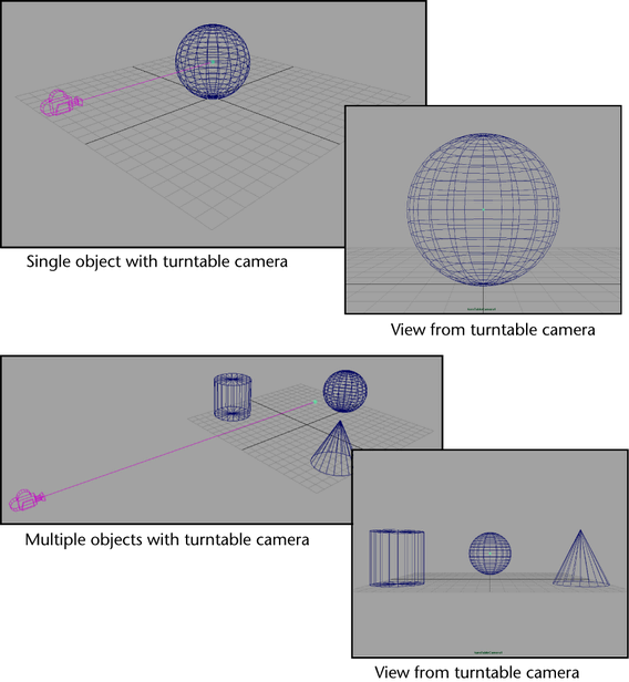 Turntable cameras are animated by default. On playback, the turntable camera follows a 360 degree orbit around its target objects. From the turntable camera’s view, it appears as if the objects you are reviewing are rotating 360 degrees.